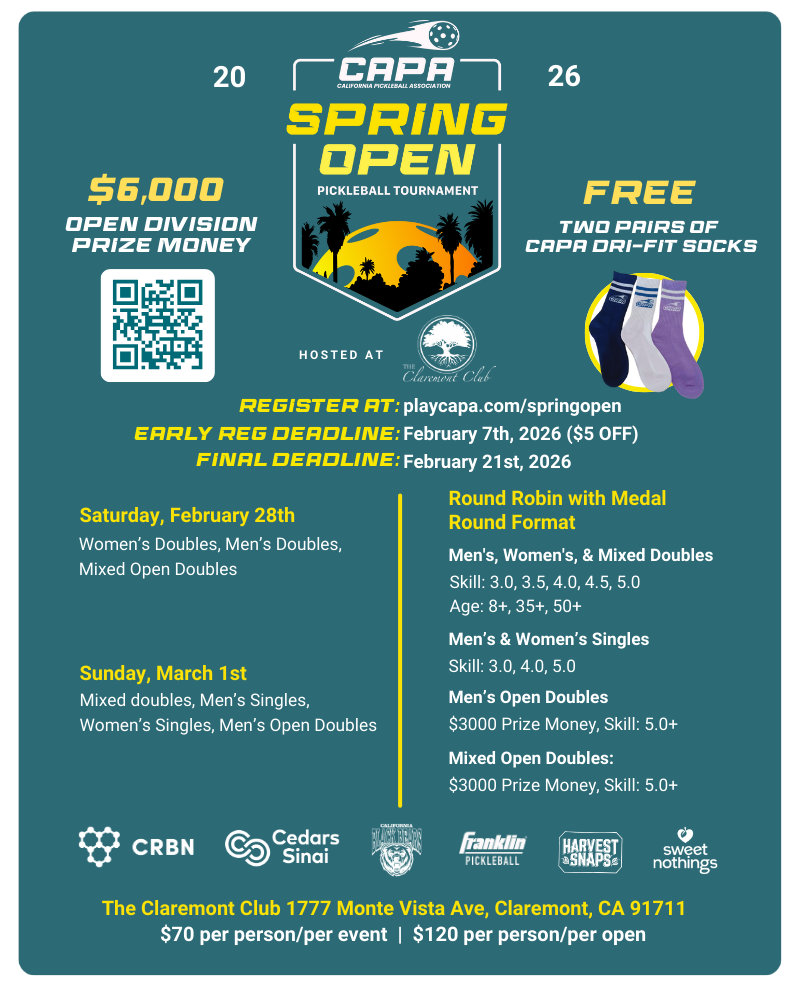 The CAPA Spring Open 2026 will be held on Feb 28th-Mar 1st at The Claremont Club, Claremont, CA. Register today!