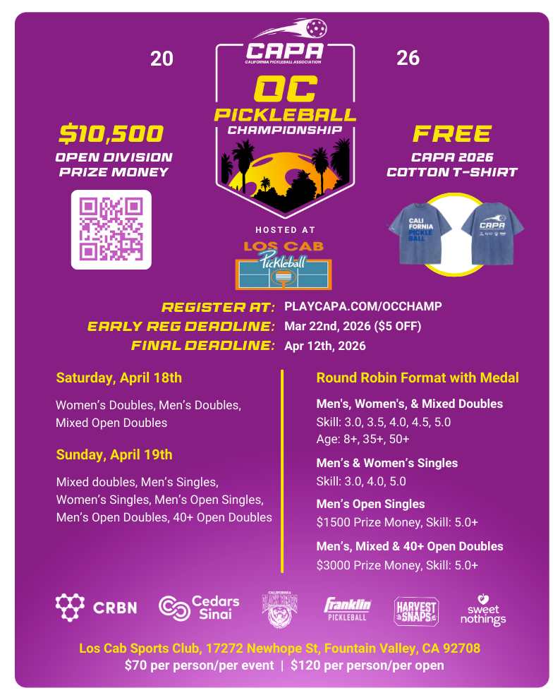 The CAPA Tournament of Champions 2026 will take place December 11–13 at Los Cab Sports Club, featuring $18,000 in total prize money and three days of elite pickleball competition built for the best players in California. Open division payouts include $4,000 each for 40+ Open Doubles, Mixed Open Doubles, Women’s Open Doubles, and Men’s Open Doubles, plus $2,000 for Open Singles. Every participant will also receive an exclusive Beige CAPA Tournament of Champions Hoodie. 🔥
