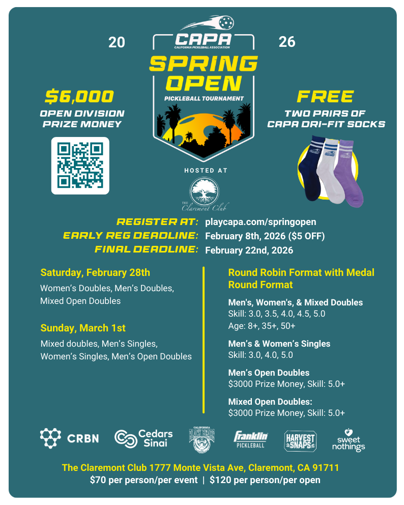 Email capickleballassociation@gmail.com for any tournament inquiries.
